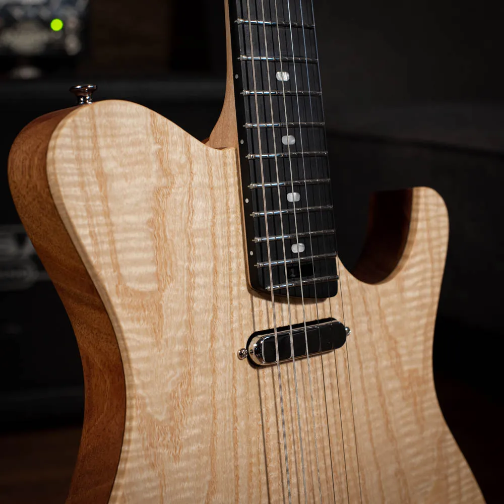 Le micro manche offre un son rond, précis et chaleureux. Le micro chevalet, plus incisif et tranchant, restitue le fameux twang qui a marqué des générations de guitaristes — avec une réponse dynamique et naturelle grâce à mes micros bobinés à la main.